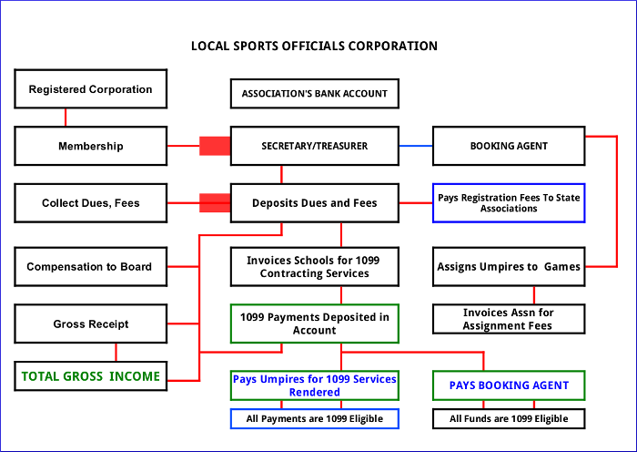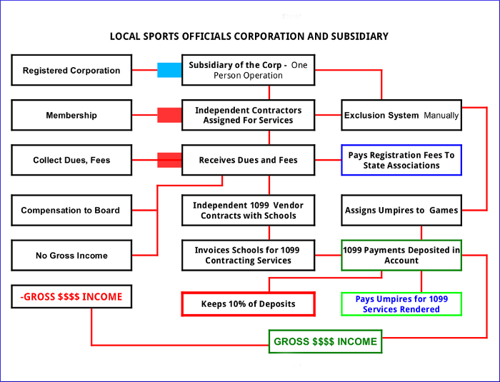 Majority of funds will end up being handled by one person, without oversight from the membership and a third-party. Funds are funnelled to the subsidary of the corporation. This one person operation (designated as CEO on state documents) becomes the secretary, treasurer, point of contact, who writes and signs all checks on the first bank account and the second bank account. This one-person also, procures 1099 contractual services, invoices clients, deposits checks and pay officials for contracting services. Funds from clients are deposited in a second bank account.